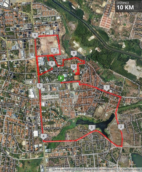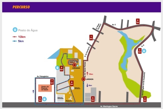 Seguirão por trás do Centro de Convenções e pegarão à Washington Soares novamente, agora à esquerda, até entra na Unifor pela Reitoria. Dentro do campus, passarão pela Biblioteca, dobrando à esquerda no bloco T e contornando os demais blocos até chegar à rotatória. Seguirão pela Rua Fantasma, Lagoa e lateral do Estádio de Atletismo. Entrarão na pista de atletismo pelo portão da curva 350m, raia 1, até à chegada oficial da pista. (veja abaixo o mapa dos 10 km ampliado)