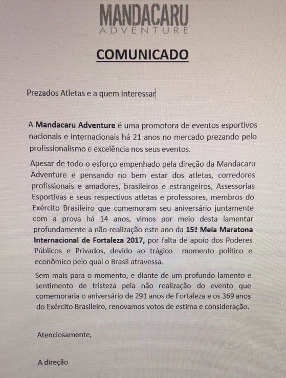 CANCELAMENTO DA 15ª MEIA MARATONA DE FORTALEZA - ANO DE 2017